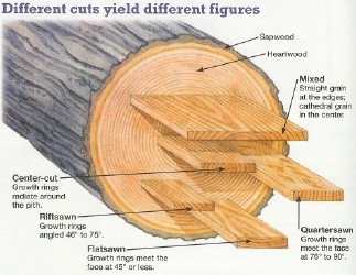 This is the easiest and fastest way to cut lumber. The width of the boards is determined by the diameter of the log. The boards are cut to the desired thickness until the cant has been completely cut. Any boards with growth rings less than 45 degrees are “plain” sawn. Some quarter sawn lumber will result using this sawing method.